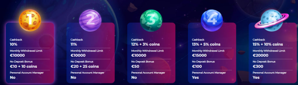 Το CosmicSlot Casino διαθέτει ένα πρόγραμμα VIP που επιβραβεύει τους πιστούς παίκτες με διάφορα προνόμια και μπόνους. Το πρόγραμμα περιλαμβάνει πέντε επίπεδα με διαφορετικά οφέλη, τα οποία αυξάνονται όσο προχωράτε στα επίπεδα.