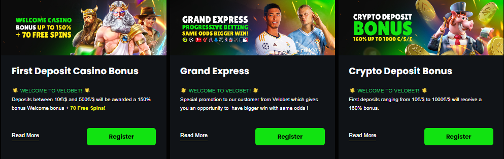 VeloBet Casino offers various bonuses, such as welcome bonus, deposit bonus, cashback, and special offers for cryptocurrency deposits.