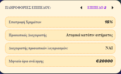 | 2 | 15% | Ατομικά κατόπιν αιτήματος | ΝΑΙ | €20,000 |