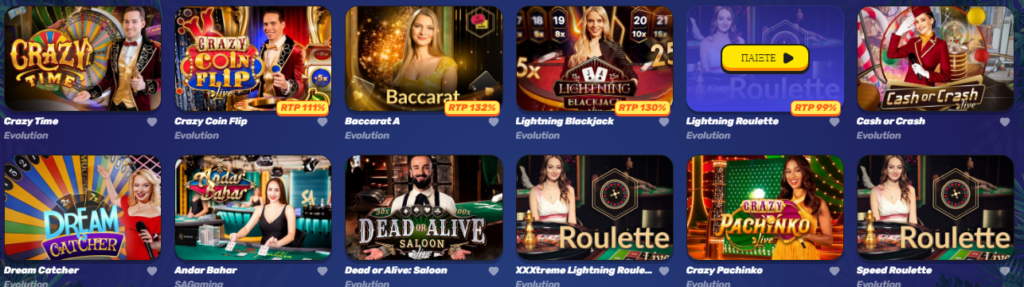 - Ζωντανό Καζίνο: Πραγματική εμπειρία καζίνο με live dealers για παιχνίδια όπως Ρουλέτα, Μπλάκτζακ και Μπακαρά, φέρνοντας την ατμόσφαιρα ενός καζίνο στο σπίτι σας.