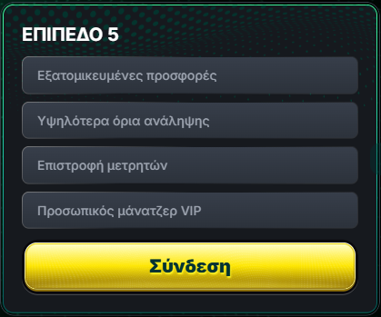 | Επίπεδο 5 | Εξατομικευμένες προσφορές, Υψηλότερα όρια ανάληψης, Επιστροφή μετρητών, Προσωπικός μάνατζερ VIP |