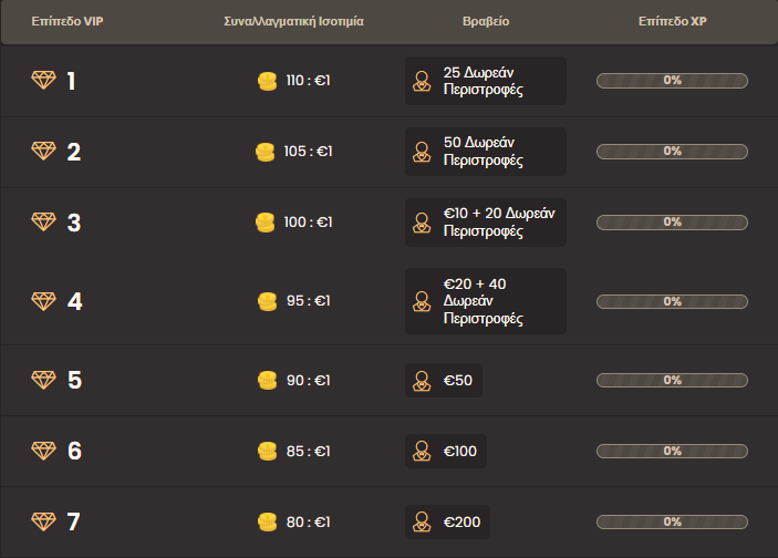 | Επίπεδο VIP | Συναλλαγματική Ισοτιμία | Βραβείο | Επίπεδο XP |