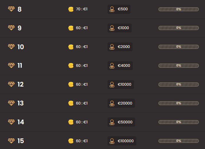 Οι πόντοι εμπειρίας συγκεντρώνονται με κάθε στοίχημα που τοποθετούν οι παίκτες, και η συναλλαγματική ισοτιμία μειώνεται καθώς προχωρούν σε υψηλότερα επίπεδα, καθιστώντας ευκολότερο να κερδίσουν επιπλέον πόντους. Τα βραβεία περιλαμβάνουν δωρεάν περιστροφές και χρηματικά έπαθλα, με τα υψηλότερα επίπεδα να προσφέρουν σημαντικές χρηματικές ανταμοιβές.