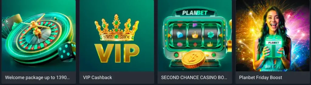 Το πακέτο καλωσορίσματος του PlanBet Casino περιλαμβάνει 100 % έως 1 500 € και 150 δωρεάν περιστροφές. Το ελάχιστο ποσό κατάθεσης για ενεργοποίηση είναι 10 €, ενώ το μπόνους έχει απαίτηση τζιραρίσματος x35.