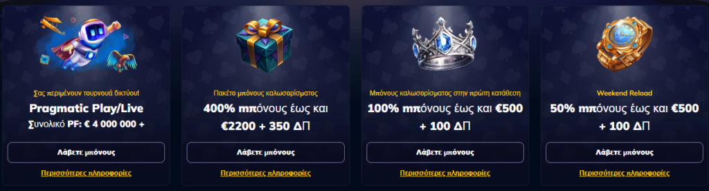 Το καζίνο προσφέρει μπόνους καλωσορίσματος, προσφορές επαναφόρτωσης, δωρεάν περιστροφές και επιστροφή χρημάτων μέσω του VIP προγράμματος.