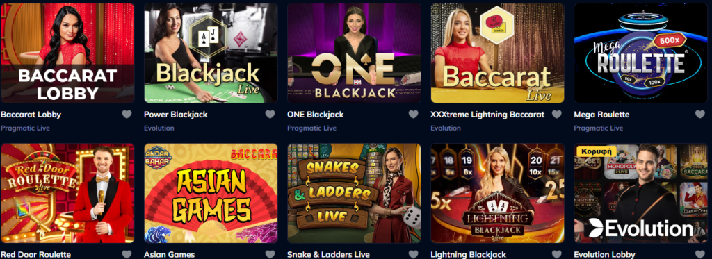 - Ζωντανό Καζίνο (Live Casino) – Ζήστε την ατμόσφαιρα ενός πραγματικού καζίνο με live dealers σε παιχνίδια όπως Live Blackjack, Live Roulette και Game Shows από την Evolution Gaming και άλλους κορυφαίους παρόχους.