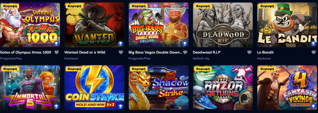 - Φρουτάκια (Slots) – Με χιλιάδες επιλογές, συμπεριλαμβανομένων κλασικών, βίντεο και τζακπότ slots από παρόχους όπως NetEnt, Play’n GO και Pragmatic Play.