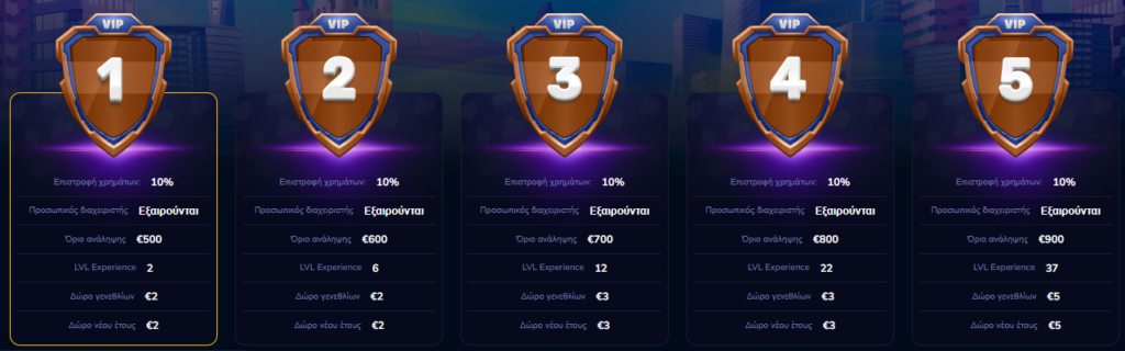 | VIP Επίπεδο | Επιστροφή Χρημάτων | Προσωπικός Διαχειριστής | Όριο Ανάληψης | LVL Experience | Δώρο Γενεθλίων | Δώρο Νέου Έτους |