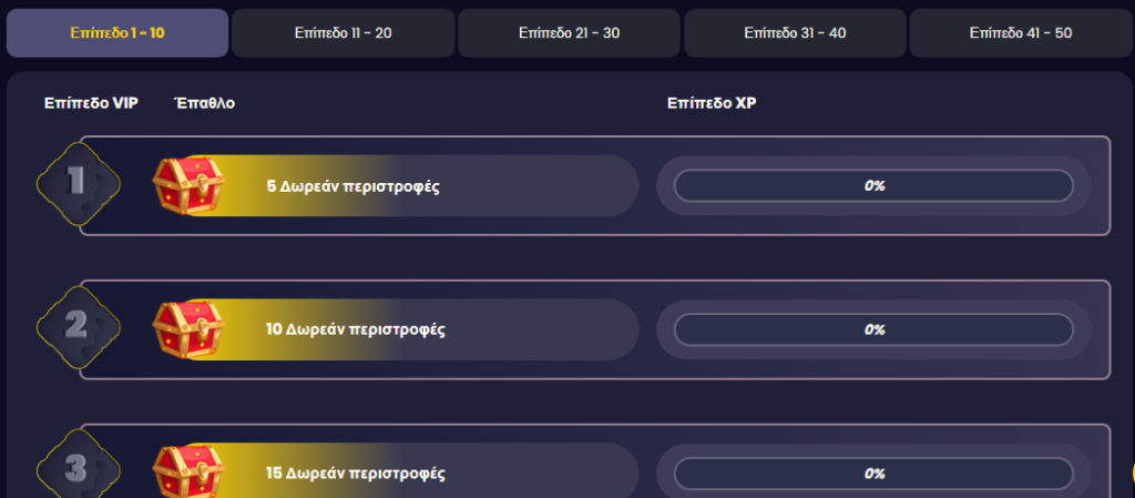 Ναι, υπάρχει πολυεπίπεδο VIP πρόγραμμα με έπαθλα και δωρεάν περιστροφές ανά επίπεδο.