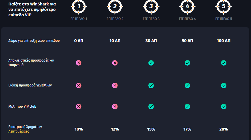 | Επίπεδο 3 | 30 ΔΠ | – Αποκλειστικές προσφορές & τουρνουά – Δώρο για νέο επίπεδο – Μέλος VIP club | 15% |